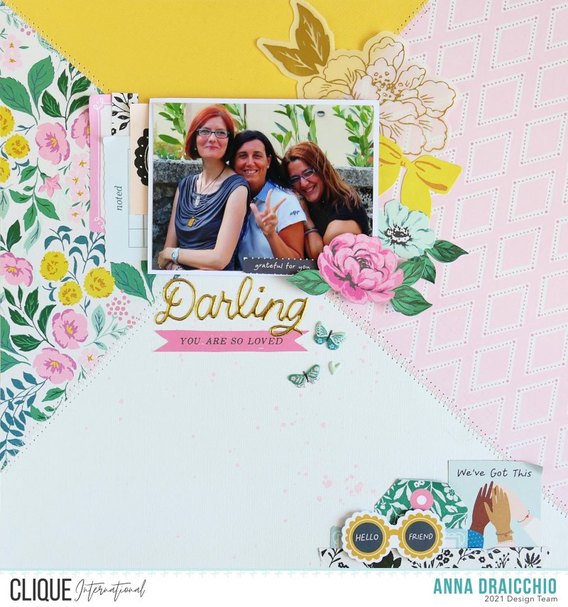 I’m delighted to share this page for the Clique International Design Team! Lately I was drawn to the diagonal lines. When I sat down to create this layout with a photo of my creative friends Manu and Cri, I created two diagonal lines that led directly to my photo. To lead you through my design process while creating this layout, I’ve created a video! Please feel free to ask any questions or leave any comments and don’t be afraid to use diagonal lines to create movement on your next layout.