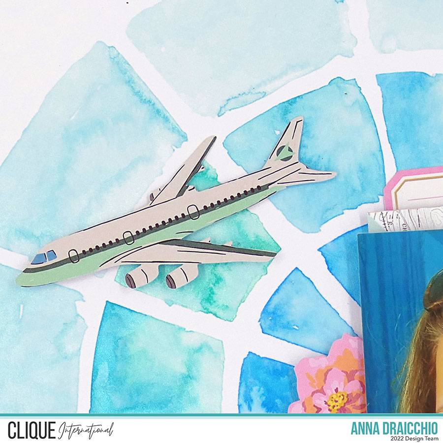 Design team project for Clique Kits , a Summer Scrapbook Layout using watercolor, stencil, Cut file and beautiful kit.